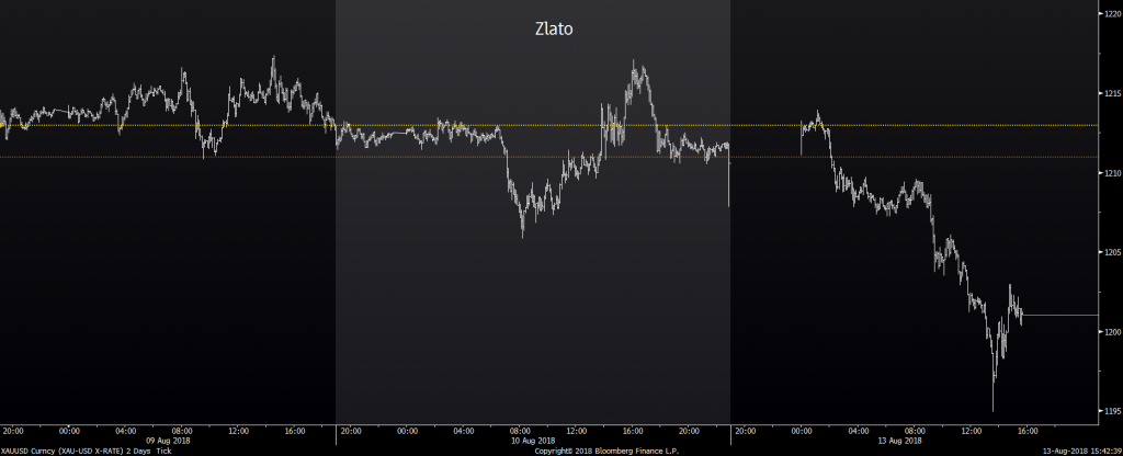 Zajímavý je v dosavadním průběhu pondělní seance pohyb zlata. To kleslo pod úroveň 1200 dolarů za unci poprvé od března 2017. Zlato dohánělo páteční posilování amerického dolaru, na které v podstatě nereagovalo. Investoři nezačali zlato nakupovat ani při nárůstu rizikové averze v souvislosti s Tureckem a dali přednost tzv. bezpenčným přístavům na forexu – hlavně CHF a JPY. Možná proto, že zlato nemá kvůli zvyšování sazeb v USA dlouhodobě příznivý fundament. Co se týká ropy, tak tady jsme se nedočkali výrazných pohybů. Brent bojoval o úroveň 72,50 dolarů za barel a americká ropa WTI se pohybovala jen těsně nad 67 dolarovou hladinou.