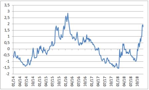 Situácia na trhoch sa podľa indexov finančných podmienok od zasadnutia FEDu výrazne zhoršila. Náš index finančných podmienok, ktorý priemeruje smerodajné indexy troch takýchto indexov (z dielne Goldman Sachs, FEDu a Bloombergu) od päťročného priemeru výrazne vyskočil a už nie je ďaleko od maxím z roku 2016, kedy prebiehala posledná vlna napätia na trhoch. Trhy teda počítajú s tým, že FED sa bude snažiť ich upokojiť, pretože aktuálna situácia už má presah do reálnej ekonomiky, čo ešte pred mesiacom nebolo tak zrejmé.