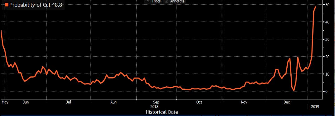Po udalostiach z utorka noci (výrazné zníženie prognóz tržieb Applu a následnej menšej panike na trhoch) a včerajška (prepad výrobnej dôvery za december), sa stala na futures trhoch veľmi zaujímavá vec, ktorá odzrkadľuje aktuálny postoj trhov k budúcemu vývoju ekonomiky – implikovaná pravdepodobnosť, že FED tento rok zníži sadzby vyskočila k 50%, a to z menej než 20%. Ešte niekedy v novembri pritom bola takmer na nule.
