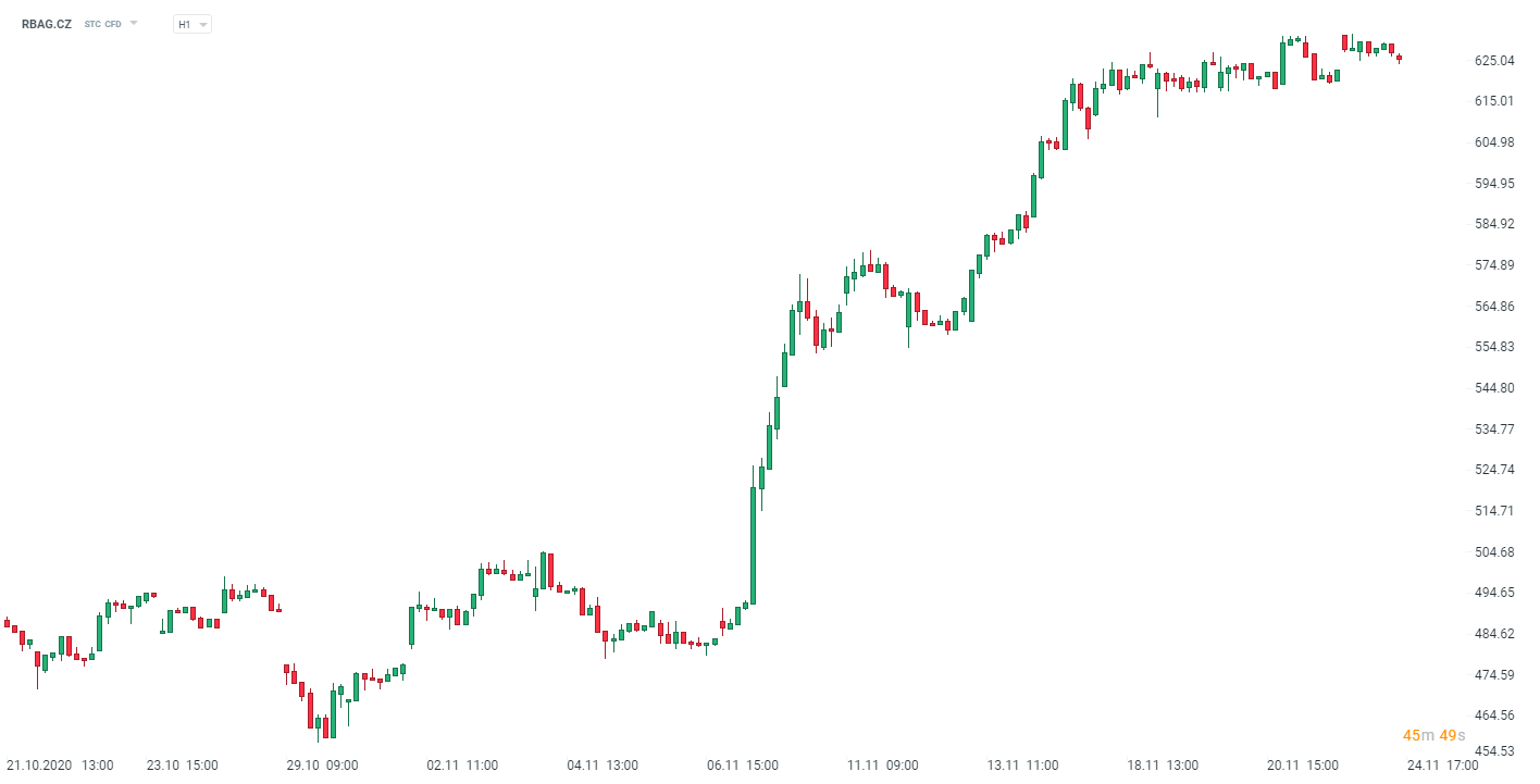 Akcie společnosti Erste Bank (RBAG.CZ) vzrostly od počátku měsíce už o 31 %. Zdroj: xStation5