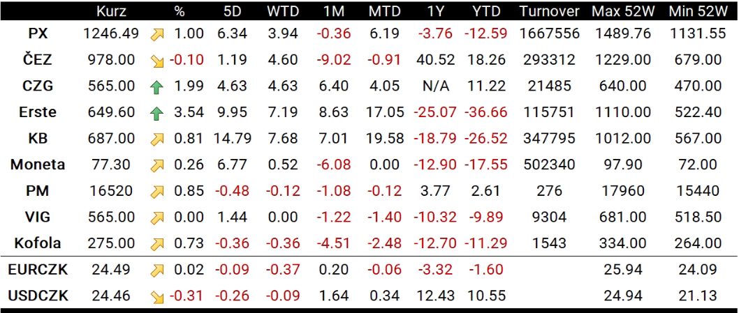 Nejvýkonnějším titulem se dnes stala ERSTE (RBAG.CZ), která si připsala 3,54 % a uzavřela dnešní seanci na 649,60 Kč za akcii. Banka reagovala na návrh Evropské komise o mimořádné dani, protože ta s větší regulací bankovního sektoru nepočítá. Nicméně se banky mimořádnému zdanění nevyhnou. Dle ministra financí Zbyňka Stanjury by si měl svou regulaci zavést každý stát zvlášť. Tento týden by však k předložení návrhu na půdě Vlády ČR dojít nemělo. Mírnější nárůsty zaznamenala Komerční banka (KOMB.CZ), jež získala 0,81 % a uzavřela na 687 Kč za akcii a Moneta (MONET.CZ) s 0,26% ziskem. Výkonnost hlavního trhu nepodpořil ČEZ (CEZ1.CZ). Ten si připsal 0,1% ztrátu a korigoval zisky z počátku týdne.