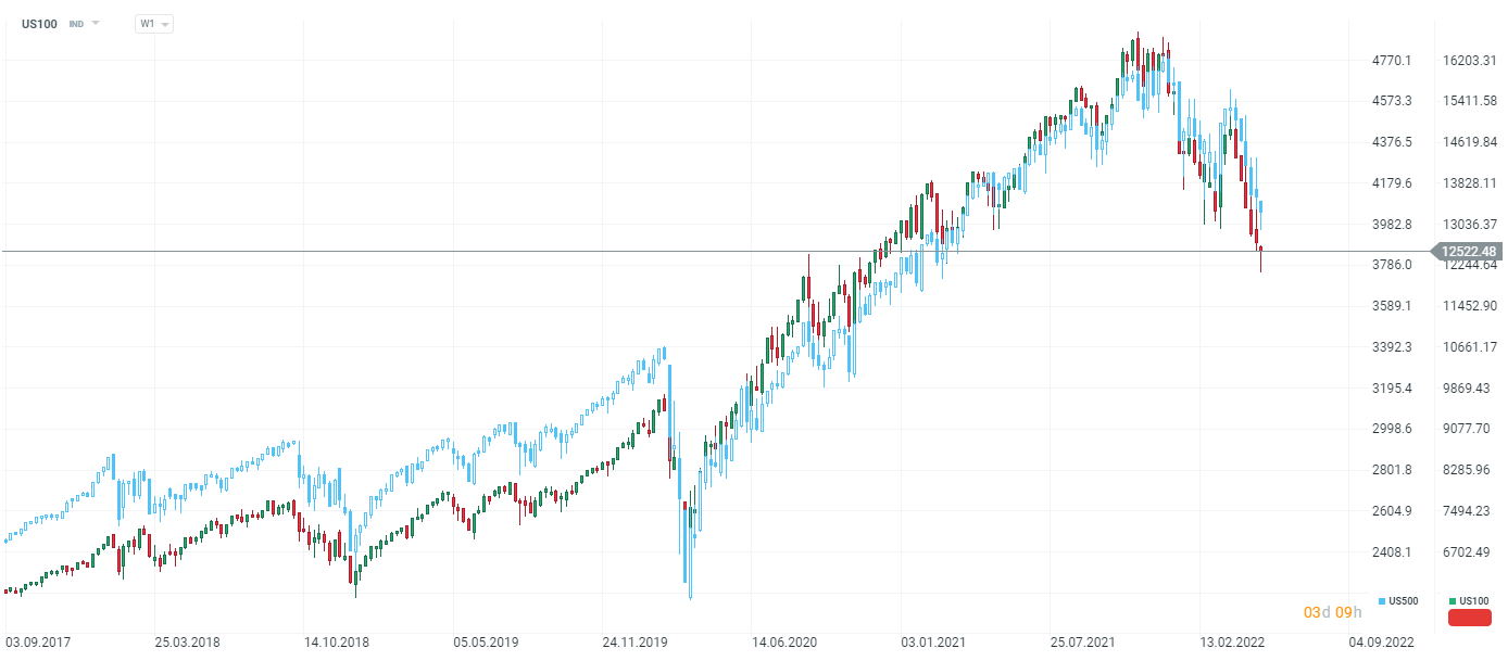 Interval W1. Výkonnost indexu US500 a US100. Zdroj: xStation5