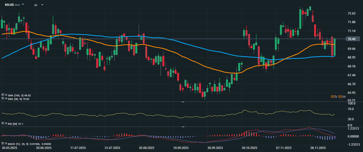Akcie spoločnosti Coca-Cola sa aktuálne obchodujú na úrovni 70,49 USD a v posledných dňoch sa pohybujú v blízkosti kľúčových technických úrovní. Cena našla silnú podporu v blízkosti kĺzavého priemeru SMA 100 (69,02 USD) a následne sa od tejto úrovne odrazila späť nad EMA 50 (70,04 USD). RSI sa nachádza na úrovni 51,1, teda v neutrálnej zóne, čo signalizuje rovnováhu medzi nákupným a predajným tlakom.