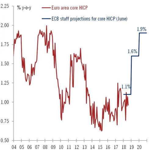Čo sa týka inflácie, tak júnové projekcie hovorili o o celkovej inflácii na úrovni 1,7% pre roky 2018-2020. Celková inflácia je však výrazne skreslená cenami ropy (ktoré však od júna príliš nerástli), zaujímavejšie sú projekcie jadrovej inflácie, ktoré bývajú chronicky revidované nadol. V júni počítala ECB s jadrovou infláciou na úrovni 1,1% pre 2018 a s jej prudkým zrýchlením na 1,6%, resp. 1,9% v rokoch 2019 a 2020. Už viackrát som písal, že aj tohtoročných 1,1% je nereálnych. To by musela byť jadrová inflácia v zvyšných štyroch mesiacoch roka minimálne 1,18%. A tak vysoko ešte nebola v tomto roku ani v jednom mesiaci. Projekcie jadrovej (a pravdepodobne aj celkovej) inflácie teda pôjdu nadol minimálne pre rok 2018.