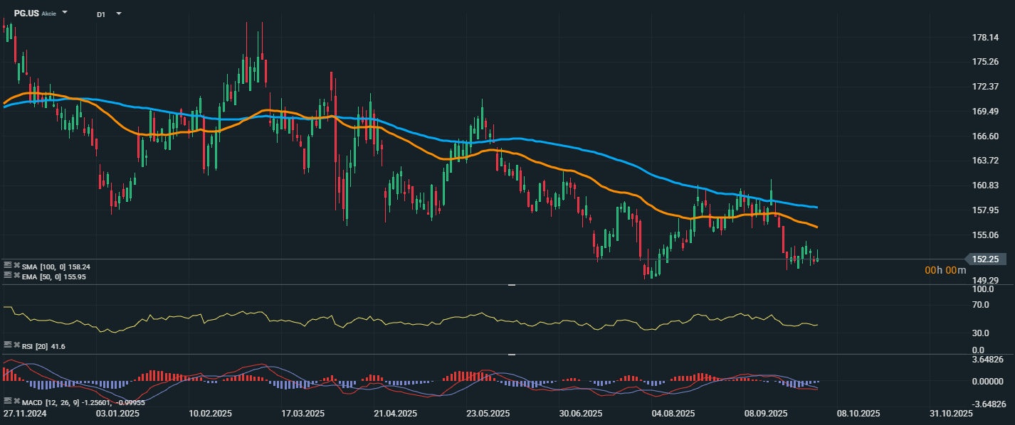 Akcie spoločnosti Procter & Gamble sa aktuálne obchodujú okolo úrovne 152,25 USD, teda pod kĺzavými priemermi EMA 50 (155,95 USD) a SMA 100 (158,24 USD), ktoré teraz fungujú ako silné rezistencie. Vývoj ceny tak zostáva v zostupnom trende, ktorý sa začal v polovici roka 2025 a doteraz nebol technicky narušený. RSI (41,6) sa pohybuje v neutrálno-prepredanej oblasti a zatiaľ nenaznačuje výrazný nákupný záujem.