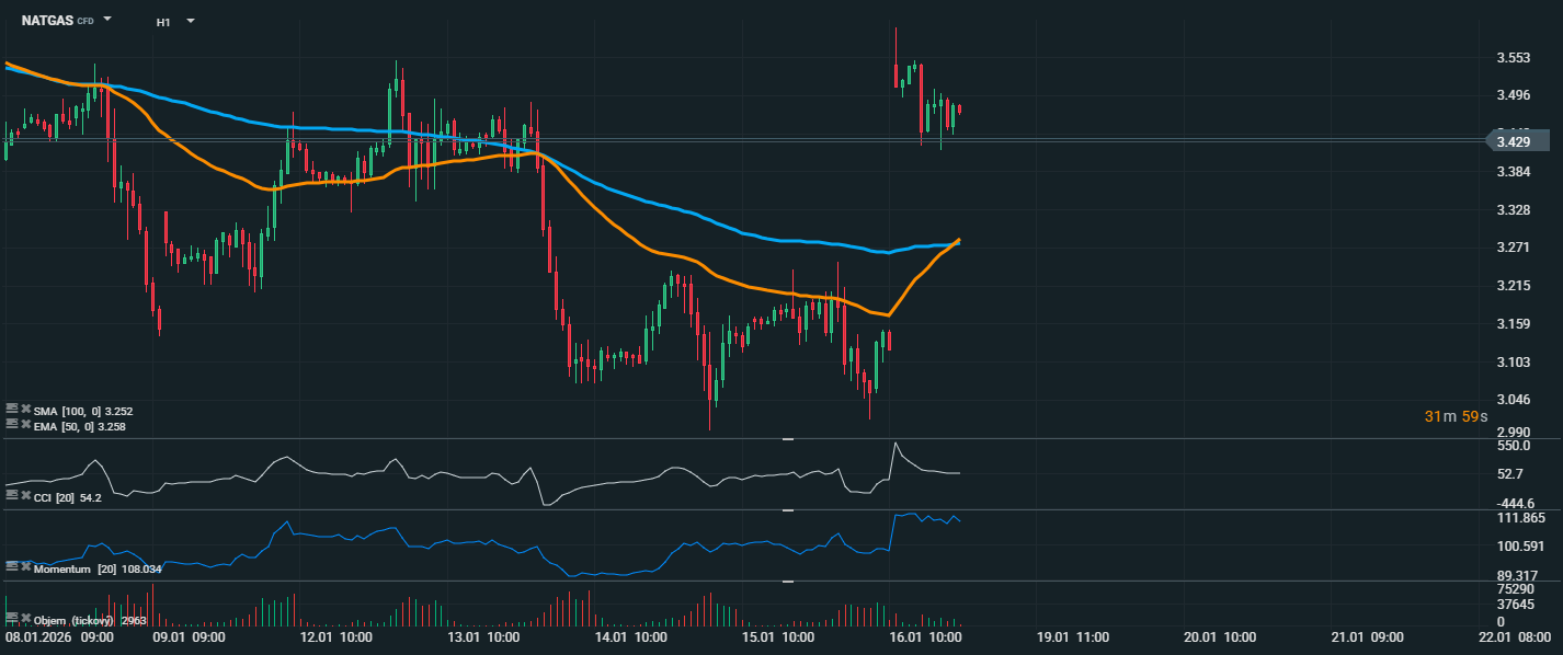 Cena zemného plynu sa v súčasnosti obchoduje na úrovni 3,429 USD a po otvorení trhu cez víkend zaznamenala prudký rast, ktorý ju vyniesol na maximum 3,553 USD. Po dosiahnutí tejto úrovne došlo k krátkodobej konsolidácii, ale celkové technické nastavenie zostáva býčie. Dôležitým signálom je prelomenie nad kĺzavými priemerkami – cena sa teraz drží nad EMA 50 (3,258 GBP) a nad SMA 100 (3,252 GBP). Táto situácia naznačuje zmenu trendu z klesajúceho na rastúci a považuje sa za potvrdenie nákupnej dynamiky. CCI (Commodity Channel Index) je na úrovni 54,2, čo je v pozitívnom teritóriu a naznačuje mierny nákupný tlak bez známok prekúpených podmienok. Podobne je Momentum na úrovni 108,034, čo potvrdzuje pozitívny moment. Spolu tieto hodnoty podporujú pokračovanie býčieho trendu. Pokiaľ ide o objem, došlo k nárastu objemu, keď cena prekonala úroveň 3,30 USD, čo naznačuje aktívnu účasť kupujúcich počas skoku ceny. Z technického hľadiska je teraz kľúčové, či cena udrží podporu v rozmedzí 3,38 – 3,42 USD. Ak áno, môže pokračovať v raste späť k odporu okolo 3,55 USD alebo vyššie. Naopak, pokles pod 50 EMA by mohol signalizovať návrat k úrovniam okolo 3,30 USD.