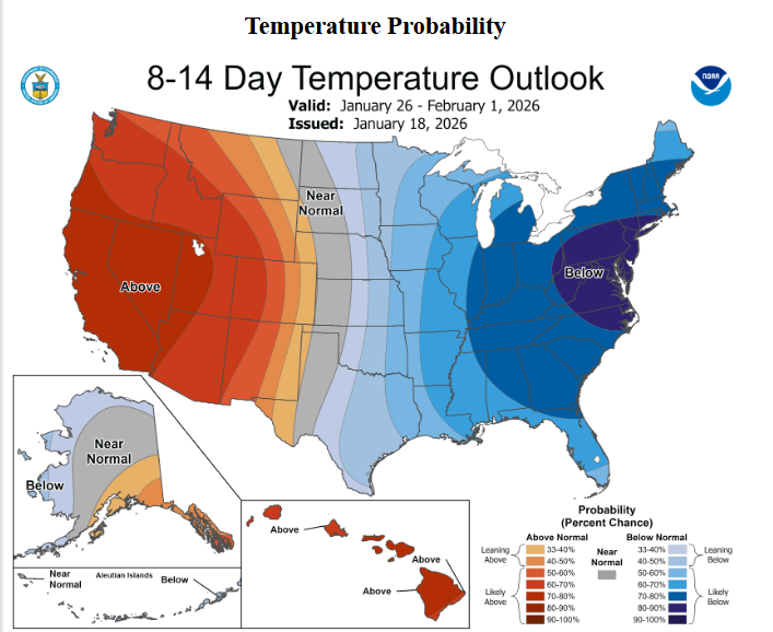 Meteorologický úrad NOAA zverejnil výhľad teplôt na obdobie od 26. januára do 1. februára 2026, ktorý ukazuje výrazne podnormálne teploty najmä na východnom a stredozápadnom pobreží USA. Podľa mapy pravdepodobnosti teplôt sa najchladnejšie podmienky očakávajú v štátoch ako New York, Pensylvánia, Ohio, Illinois, Tennessee či Kentucky, kde je pravdepodobnosť podpriemerných teplôt vyššia ako 70 %. Naopak, západná časť krajiny, vrátane Kalifornie a Arizony, zažije teploty výrazne nad normálom.