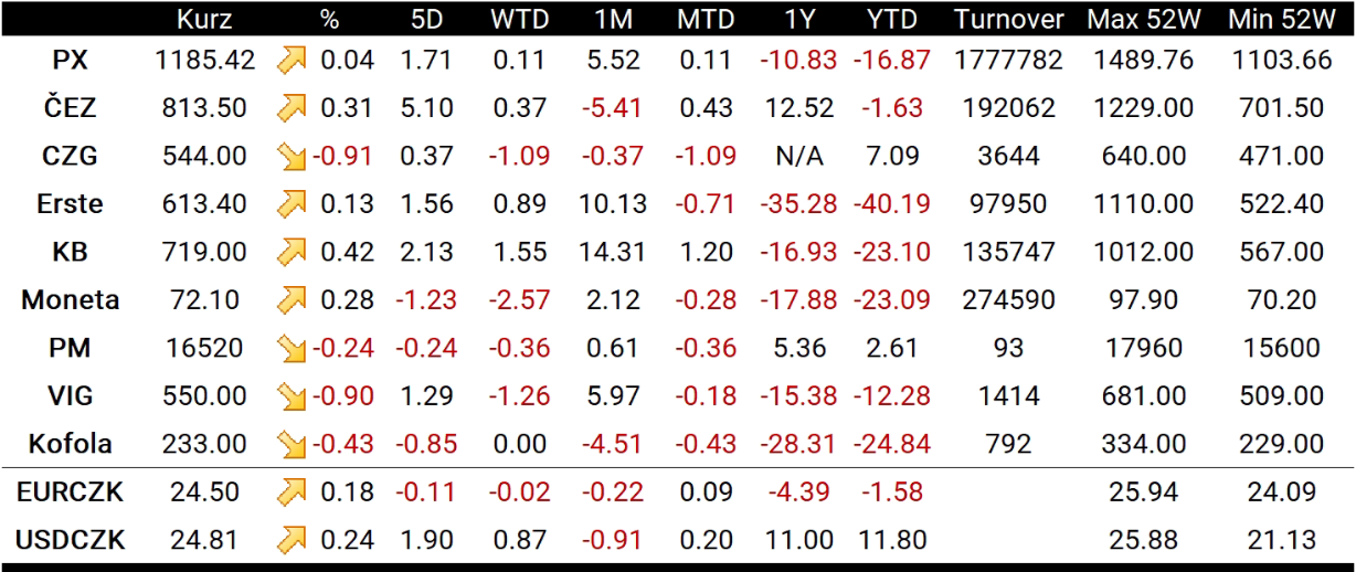 Index pražské burzy uzavřel dnešní seanci podobně jako včera s nevýrazným ziskem. Nejvýkonnějším titulem byla opět Komerční banka (KOMB.CZ), která získala 0,42 % a uzavřela na 719 Kč za akcii. Moneta (MONET.CZ) na rozdíl od včerejší seance získala 0,28 % a vrátila se na 72korunovou úroveň. Nejztrátovějšími tituly byla rakouská pojišťovna Vienna Insurance Group (VIG.CZ) a Česká zbrojovka (CZG.CZ). Obě firmy odepsaly 0,9 % své tržní kapitalizace. Energetická skupina ČEZ (CEZ1.CZ) vzrostla o 0,31 % a seanci zakončila na 813,50 Kč za akcii.