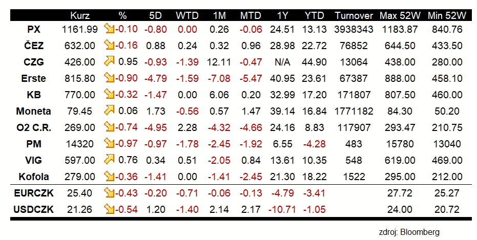 Hlavní index pražské burzy PX (CZKCASH) zakončil dnešní seanci v červených číslech. Nakonec ztratil 0,1 % a zakončil na úrovni 1 161,99 bodů. Pokles zaznamenala většina blue chips akcií. Nejvyšší ztráty dopadly na společnosti Philip Morris (TABAK.CZ;-0,97 % na 14 320 Kč) a Erste Bank (RBAG.CZ;-0,9 % na 815,80 Kč). Mírného zisku dosáhla Moneta (MONET.CZ;+0,06 % na 79,45 Kč), která nijak výrazně nereagovala na včerejší valnou hromadu, na které akcionáři zamítli financování převzetí banky ze strany PPF. Nejvyšší růst dnes předvedla Česká zbrojovka (CZG.CZ;+0,95 % na 426 Kč).