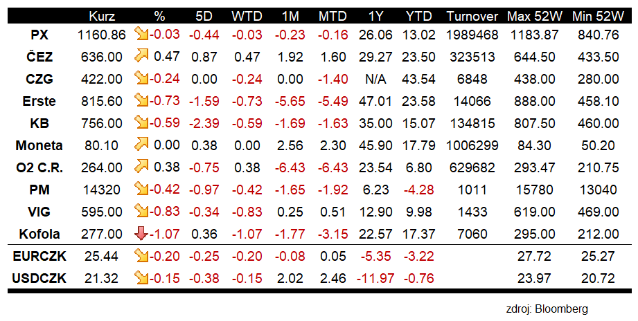Ztráty dnes táhl bankovní sektor. Erste Bank (RBAG.CZ) ztratila 0,73 % a seanci zakončila na 815,60 Kč. Komerční banka přišla o 0,59 % a klesla na závěrečnou cenu 756 Kč. Akcie Monety (MONET.CZ) zakončily seanci beze změny na pátečních 80,10 korunách. Odmítnutí financování spojení Monety se společnostmi skupiny PPF na valné hromadě, která se uskutečnila minulý týden, zatím nemá na cenu akcie výraznější dopad. Růst ceny akcie zaznamenala energetická společnost ČEZ (CEZ1.CZ;+0,47 % na 636 Kč). Dnes probíhá valná hromada společnosti, na které se schvaluje dividenda z loňského roku ve výši 52 korun na akcii.