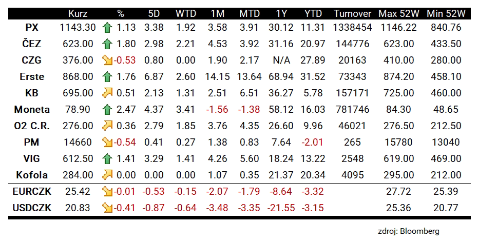 Nejvíce dnes z blue chips akcií rostla MONETA Money Bank (MONET.CZ;+2,47 % na 78,90 Kč) a v závěsu ji stíhal energetický ČEZ (CEZ1.CZ;+1,8 % na 623 Kč). Dařilo se však také dalším bankám. Este Bank (RBAG.CZ) nabídla růst o 1,76 % na 868 Kč). Komerční banka (KOMB.CZ; +0,51 % na 695 Kč) opět nabídla nejslabší růst z bankovních akcií. V červených číslech dnes skončily Philip Morris (TABAK.CZ;-0,54 % na 14 660 Kč) a Česká zbrojovka (CZG.CZ;-0,53 % na 376 Kč).