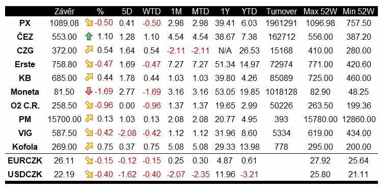 Z blue chips výrazně ztrácely akcie MONETA Money Bank (MONET.CZ;-1,69 % na 81,50), které negativně reagovaly na úmrtí ředitele a zakladatele společnosti PPF Petra Kelnera. PPF v současnosti vyjednává o převzetí banky MONETA. V současnosti má dohodu o odkoupení akcií banky za 11,3 mld. korun. Trh mohl oslabením akcií banky spekulovat na možné problémy v plánu na sloučení Monety se společnostmi z portfolia PPF. Výraznou ztrátu zaznamenala také společnost O2 (TELEC.CZ;-0,96 % na 258,50 Kč), která je PPF kontrolovaná už od roku 2013. Opačným směrem se dnes vydaly akcie energetické firmy ČEZ (CEZ1.CZ;+1,1 % na 553 Kč) a rostla také Komerční banka (KOMB.CZ;+0,44 % na 685 Kč).