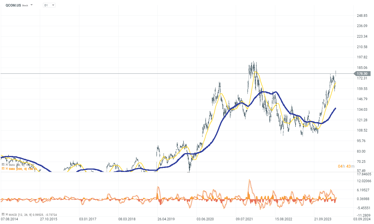 Akcie spoločnosti Qualcomm (QCOM.US) dnes posilňujú o 6,50 % na 178 USD a približujú sa k historickým maximám z roku 2022 na úrovni približne 192 USD.