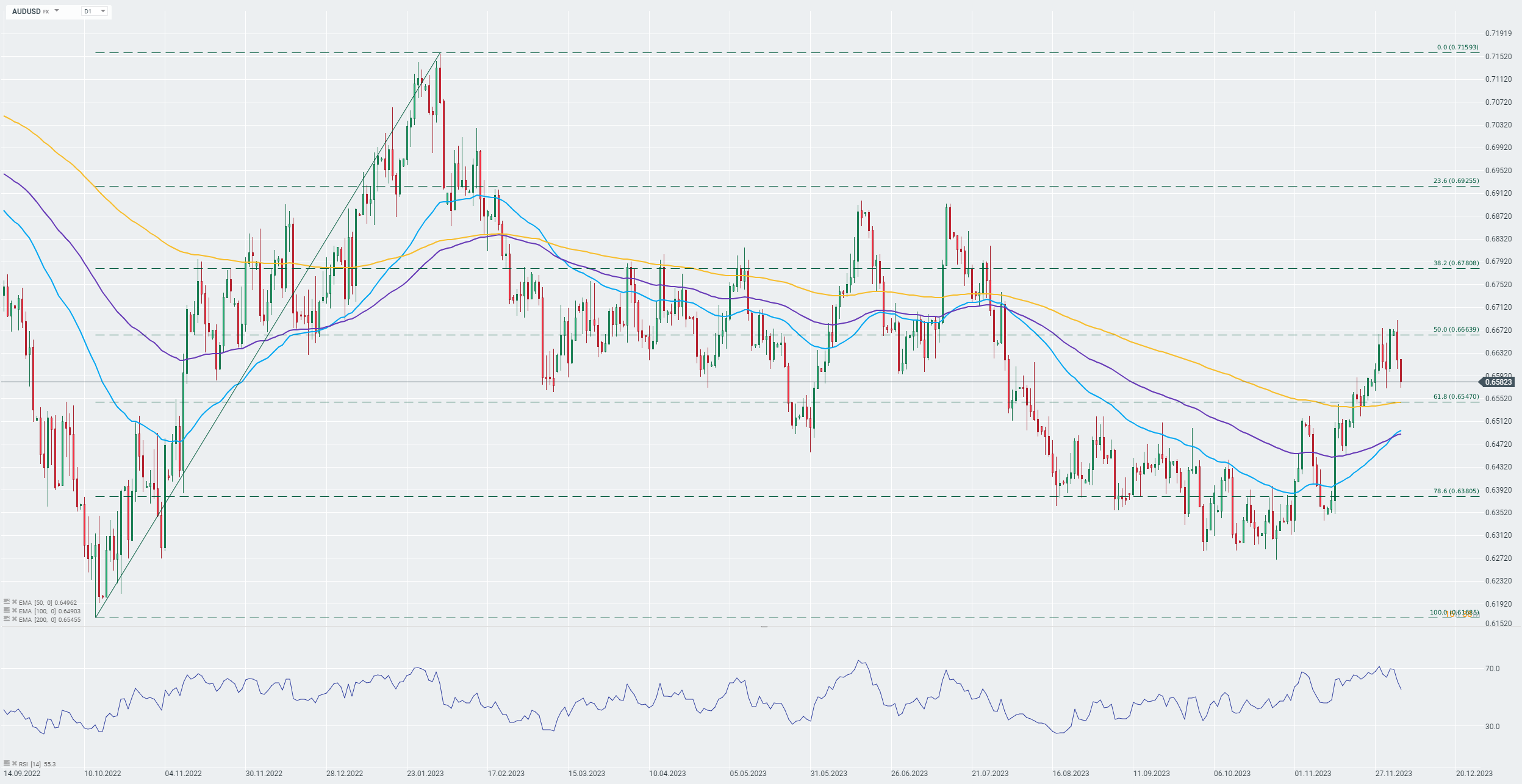 Pár AUDUSD počas dnešnej seansy stráca takmer 0,58 % a obchoduje sa v blízkosti zóny podpory stanovenej denným minimom z poslednej novembrovej seansy. Zdroj: xStation
