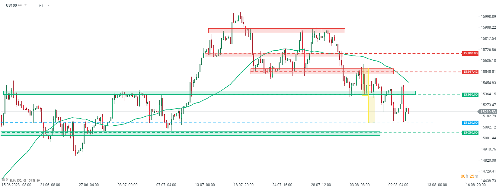 US100 dosiahol učebnicový rozsah prelomenia poklesu z nedávneho obchodného pásma a neskôr sa pokúsil o zotavenie. Indexu sa však včera nepodarilo prelomiť späť nad zónu 15 360 b. a začala sa ďalšia vlna výpredajov. Zdroj: xStation5