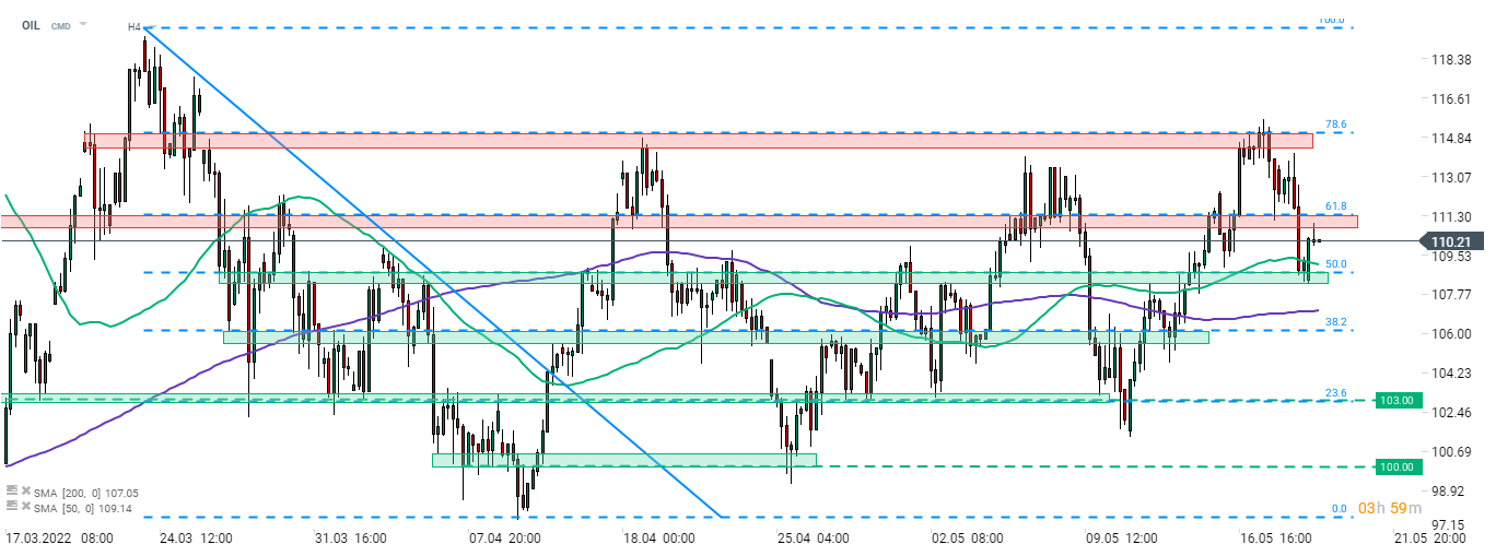 Ropa Brent (OIL) včera zaznamenala pokles, ale dnes je možné zaznamenať pokus o zotavenie. Cena našla podporu v zóne označenej 50% retracementom korekcie z marca a apríla. Zdá sa však, že býci zápasia s vytláčaním OIL nad zónu odporu označenú 61,8% retracementom. Zdroj: xStation5