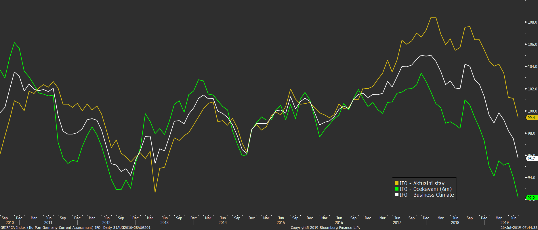Vývoj indexu Ifo v Německu. Včerejší výsledky byly nejslabší od roku 2013. Zdroj: Bloomberg
