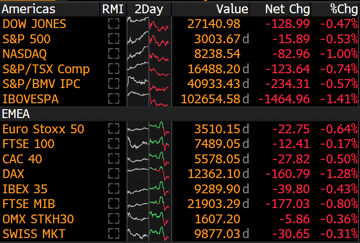 Včerejší výsledky amerických a evropských indexů. Zdroj: Bloomberg