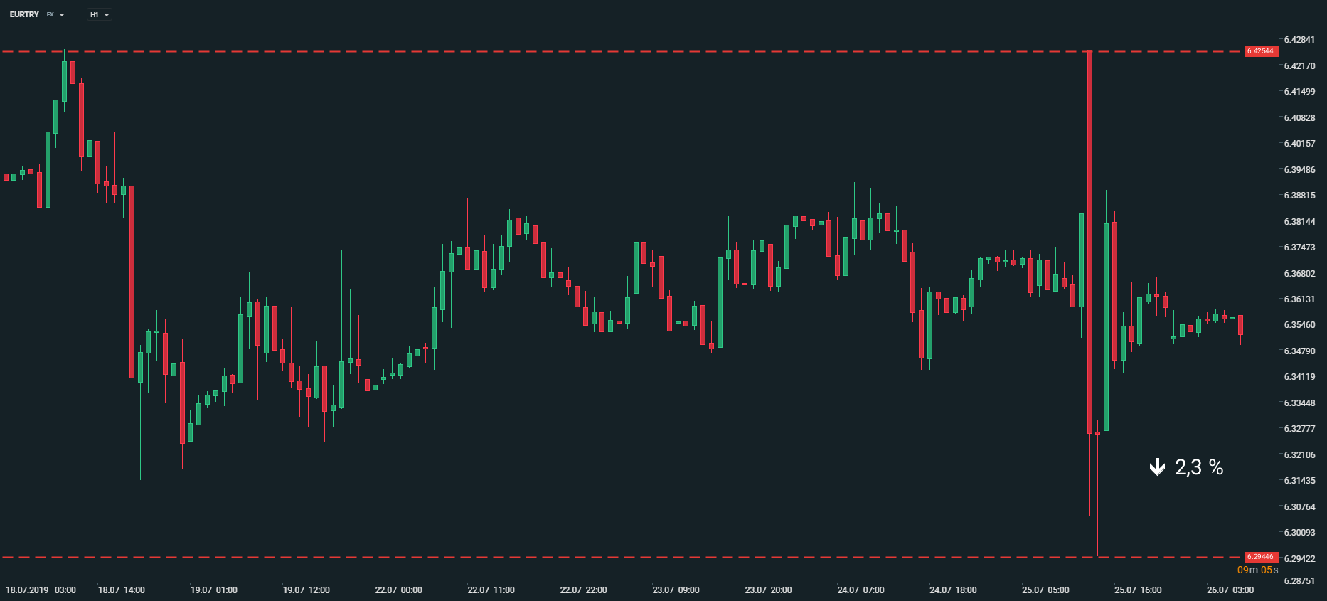 Vývoj měnového páru EURTRY po zasedání turecké centrální banky. Zdroj: xStation5