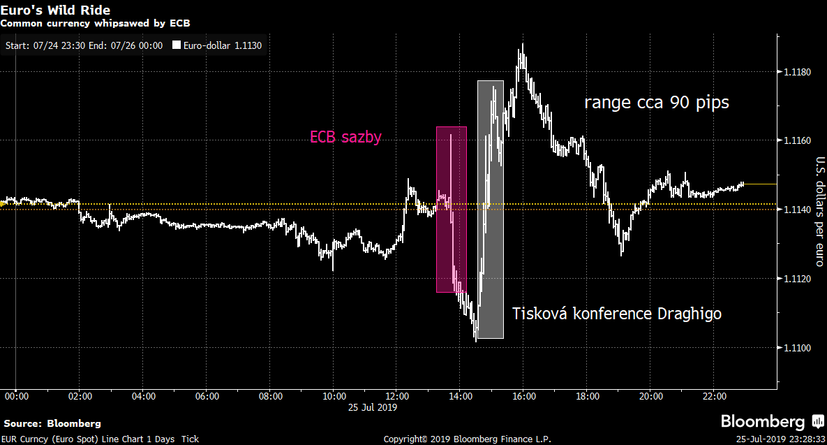 Pozornost se tak nyní zvolna přesune na americký Fed, který bude o sazbách rozhodovat poslední červencový den (ve středu). Snížení sazeb je dle trhu jisté, ovšem ve hře jsou také další nástroje měnové politiky a ECB mohla chtít vyčkat na první kroky Fedu.
