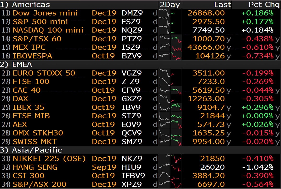 Aj napriek mierne pozitívnym správam ohľadom toho, že Čína bude zvyšovať nákupy bravčového mäsa z USA, hlavné akciové indexy v Ázii sa obchodujú v červených číslach a európske sa obchodujú zmiešane, ale tiež prevláda negatívny sentiment na európskych trhoch. Americké indexy sú jediné, ktoré sa obchodujú v zelených číslach. Zdroj: Bloomberg