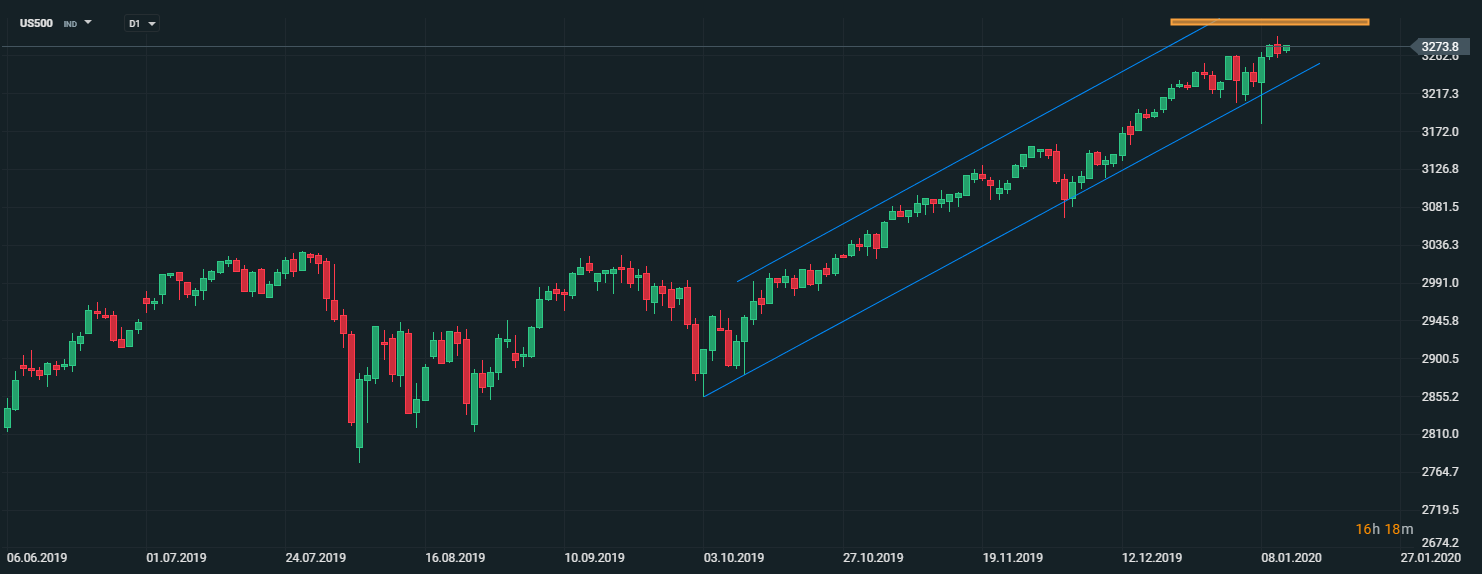 Americký akciový indexy US500 sa obchoduje v blízkosti historicky najvyšších úrovní. V prípade pozitívnych správ, môže index tento týždeň testovať psychologickú hranicu 3300 bodov. Zdroj: xStation5