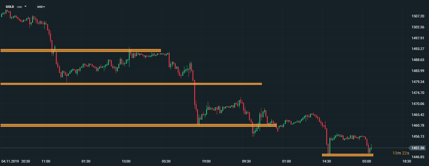 Cena zlata testuje hranicu 1450 bodov. V prípade, ak by cena dokázala spomínanú úroveň prekonať, otvoril by sa priestor na pokles k hranici 1430 USD. Zdroj: xStation
