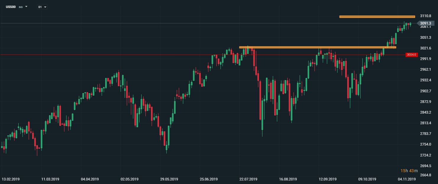 Americký akciový index US500 by dnes mohol testovať hranicu 3100 bodov a v prípade, ak dokáže denná sviečka uzavrieť nad vyššie uvedenou úrovňou, otvorí sa priestor pre rast k hranici 3200 bodov. Zdroj: xStation