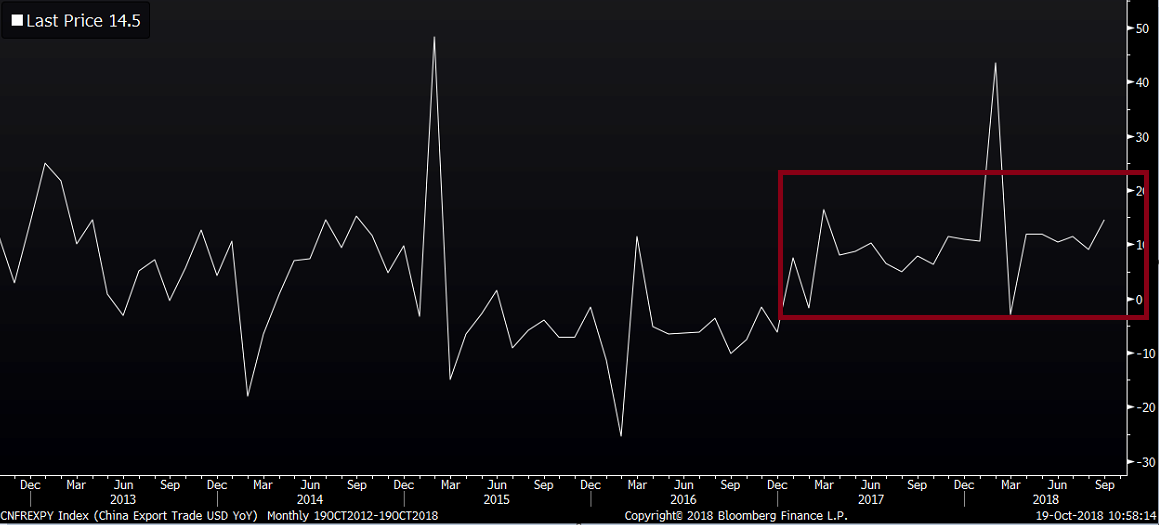 Keďže je Čína skúpa na detaily a ohľadom jej výkazníctva HDP panujú silné pochybnosti (už len kvôli minimálnej volatilite), tak sa skúsme pozrieť aspoň sprostredkovane, cez iné čísla, že čo sa vlastne deje v ekonomike a čo stojí za spomalením. Začnem tým, že obchodné vojny to zatiaľ nie sú. Medziročný rast exportov ostáva na vysokých úrovniach, v septembri dokonca ešte poskočil, keď americkí importéri zvýšili dovozy pred clami.