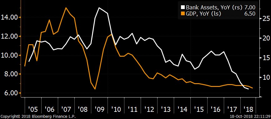 V pozadí prebieha ešte jeden proces – obmedzovanie tieňového bankovníctva zo strany čínskych autorít. Tie prebiehali predovšetkým prostredníctvom „Produktov správy majetku“, čo boli fondy s vyšším výnosom, do ktorých investovali čínske domácnosti a ktoré následne požičiavali prostriedky korporátnej sfére a aj lokálnym vládam. Tieto praktiky pomohli zvýšiť dlh korporácií a lokálnych samospráv, a produkovali množstvo nerentabilných investícií. A s tým sa vláda rozhodla zatočiť. Nižšia tvorba úverov/peňazí skrz tieňové bankovníctvo má za následok uťahovanie monetárnych podmienok.