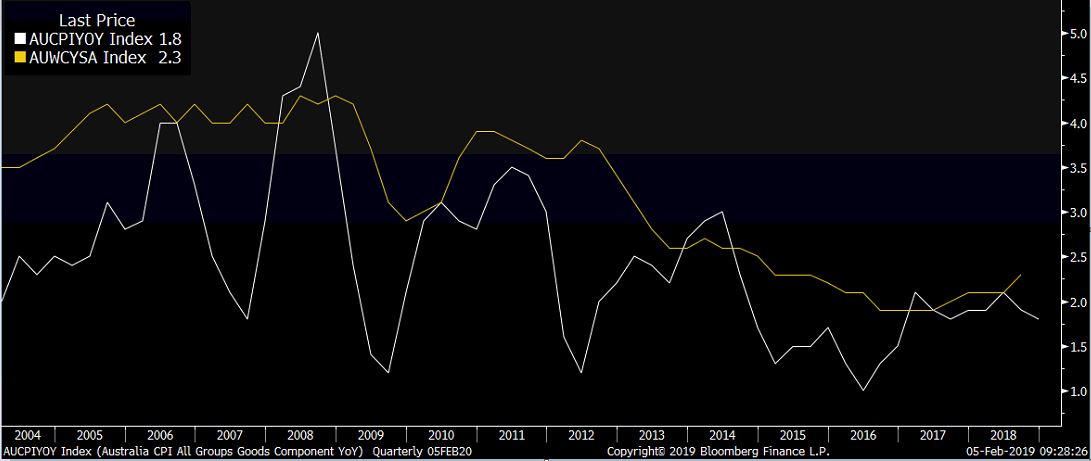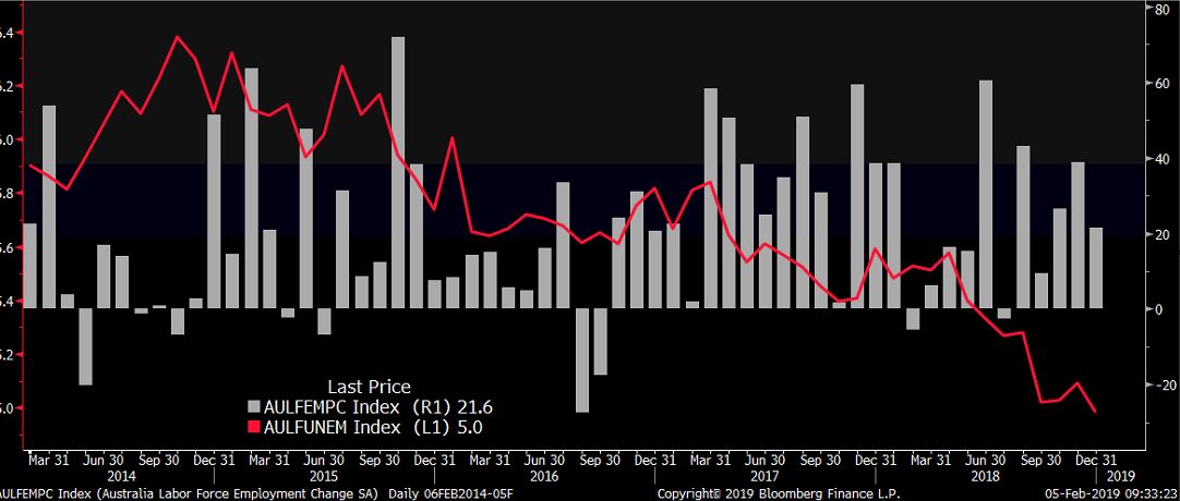 Tento komentár bol jednoznačne holubičí. Avšak vzhľadom na pozitívnu reakciu AUD menej holubičí, než čakali trhy. Pred posledným, decembrovým zasadnutím totiž trhy prideľovali zvýšeniu sadzieb v roku 2019 viac ako 70-percentnú pravdepodobnosť. Aktuálne je táto pravdepodobnosť okolo 2%, pričom zníženiu sadzieb prideľujú zhruba tretinovú pravdepodobnosť (pred decembrovým zasadnutím to bola nula). Masívny ústup trhových očakávaní, o ktorý sa postaral mierne holubičí komentár centrálnej banky v decembri a prepad na akciových trhoch, teda naznačoval, že trhy čakali ešte viac holubičí komentár.