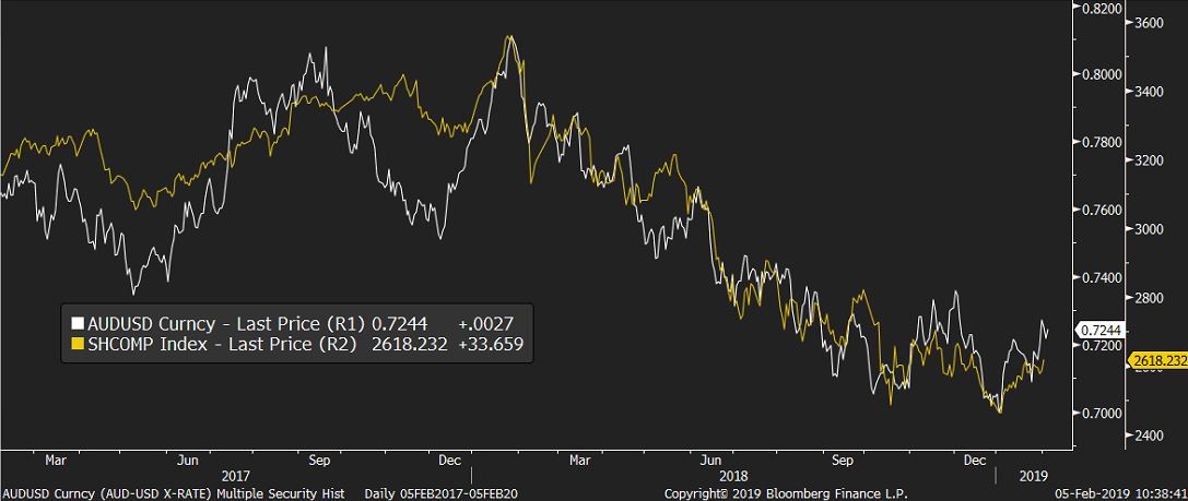Aby som to zhrnul, tak zvyšovanie sadzieb RBA v budúcom roku vyzerá byť veľmi málo pravdepodobné. Inflácia je pod cieľom, inflačné tlaky sú nízke, trh s bývaním je vo fáze kontrakcie a externé prostredie je slabšie než bývalo (navyše riziká pre neho sú skôr smerom nadol). Na druhej strane sa aktuálne hľadajú ťažko aj dôvody pre znižovanie sadzieb – rast ekonomiky je solídny a podobne je na tom aj trh práce. Pre AUDUSD to teda skôr vyzerá na pohyb v bočnom trende. Podporiť by ho však mohla prípadná obchodná dohoda medzi USA a Čínou, keďže Čína je hlavným obchodným partnerom Austrálie. Pekne to ilustruje nasledovný graf vývoja AUDUSD a čínskeho indexu Shanghai Composite.