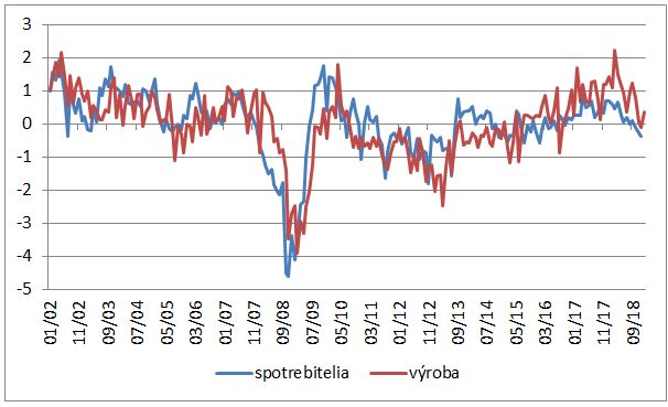 Vývoj spotrebiteľskej a výrobnej dôvery v porovnaní s dlhodobým priemerom