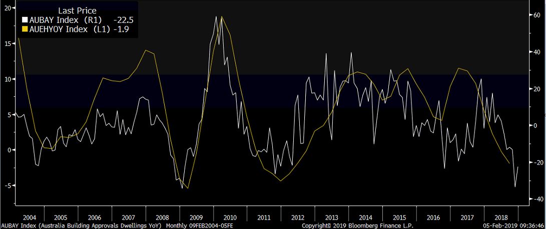 3. Je tu však aj jeden negatívny domáci faktor – trh s bývaním. Silný boom sa snažila RBA pribrzdiť limitmi na rast hypoték, čo sa jej aj podarilo. Zrejme až príliš (zadlženie domácností je však skutočne vysoké, čiže obmedzenia boli na mieste) – nové stavebné povolenia klesajú medziročne o viac ako 20% a zmena cien domov je už v mínuse. Takýto vývoj na trhu s bývaním by mal tlmiť rast spotreby domácností.
