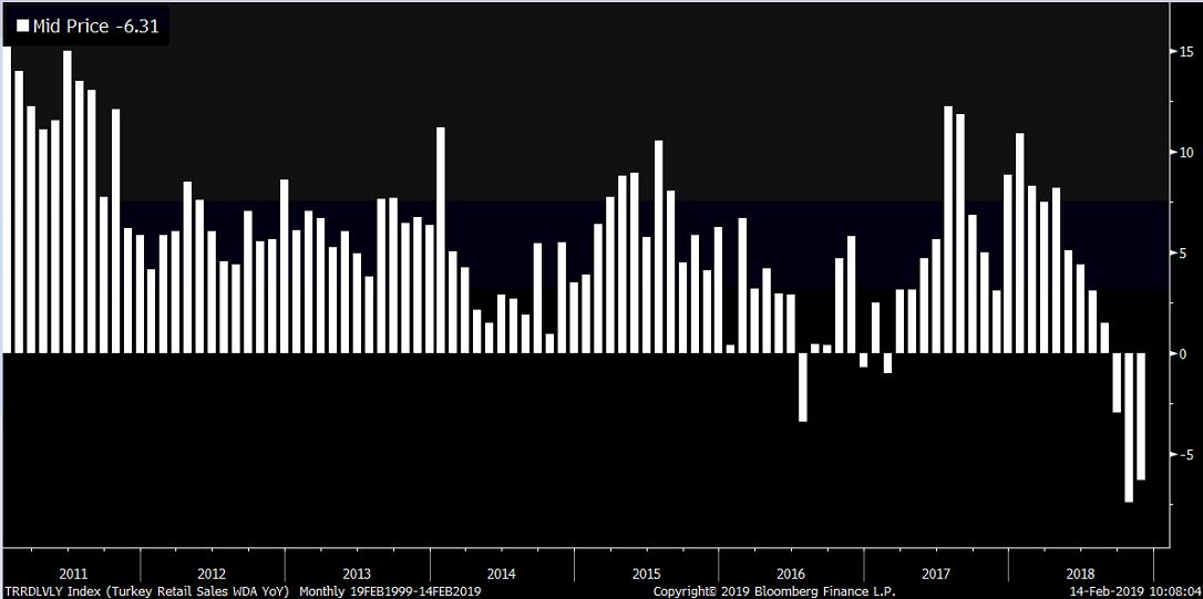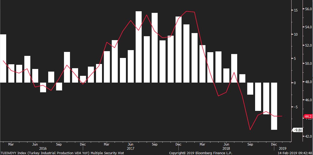 Priemyselnú výrobu ťahajú nadol predovšetkým domáce faktory (exporty tvoria len zhruba štvrtinu HDP) na čele s monetárnym šokom. Prudký prepad líry, za ktorým stáli vysoké nerovnováhy (vysoký deficit bežného účtu platobnej bilancie, vysoký dlh v cudzích menách) a Erdoganovo zasahovanie do politiky centrálnej banky, ktorá nezvyšovala úročenie, keď to bolo treba, 1) výrazne zvýšil infláciu (skrz drahšie importy), čiže ubral domácnostiam z kúpyschopnosti; 2) zastavil kohútik tokov zahraničného kapitálu do tureckej súkromnej sféry, ktorej aktivita skolabovala; 3) výrazne predražil domáci prístup k úverom, keďže centrálna banka na konci dňa kapitulovala a nakoniec z 8% na 24%.