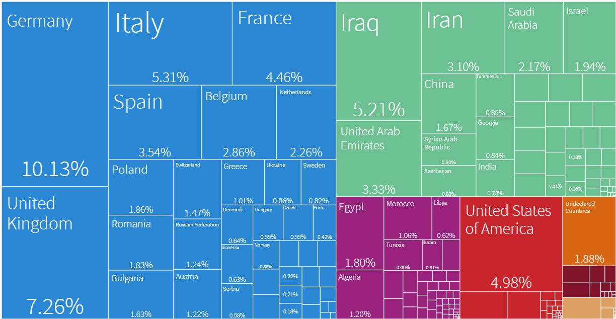 Externé prostredie taktiež nie je pre Turecko veľkou vzpruhou. Keď sa pozrieme na štruktúru exportov (graf je z roku 2016), tak trojka najväčších exportných trhov (Nemecko, Británia, Taliansko) výrazne spomaľuje a spolu s nimi aj celá európska ekonomika, kam smeruje viac ako 50% exportov. Ďalší veľký exportný trh – blízky východ, na tom tiež nie je pri nižších cenách ropy a sankciám voči Iránu príliš dobre.