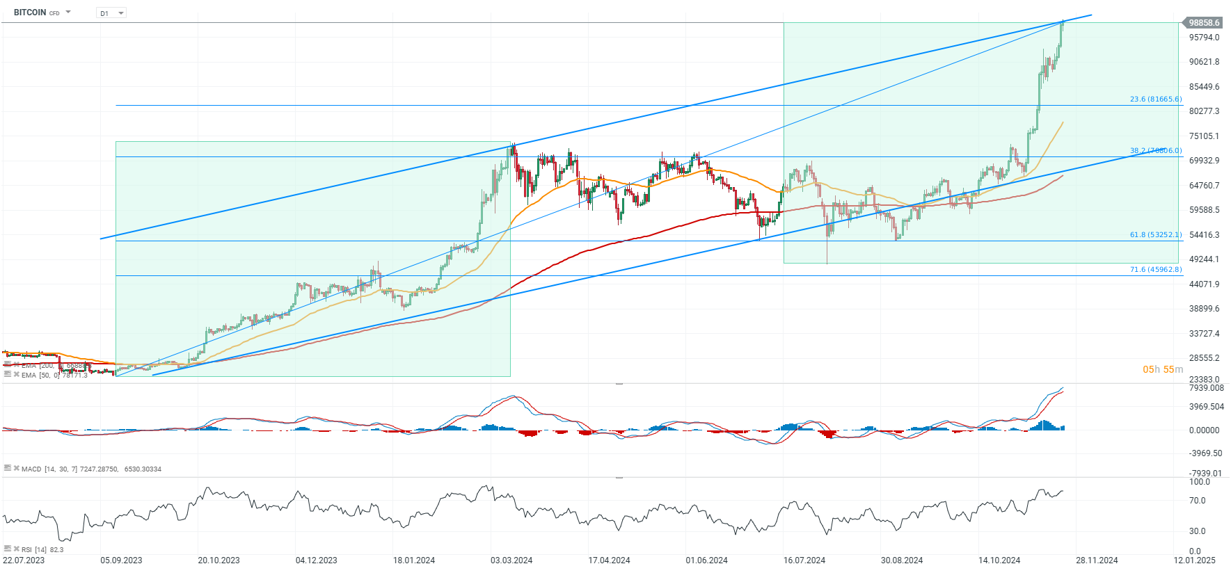 - CBOE Global Markets (CBOE.US) spustí od pondelka 2. decembra prvý produkt hotovostne vyrovnaných opcií na spotový Bitcoin. Je jasne vidieť, že investori dnes uprednostňujú menšie kryptomeny, pretože Bitcoin sa blíži k rezistenčnej zóne 100 000 USD. Bitcoinové ETF včera prilákali takmer 1 miliardu dolárov čistých prílevov, čo je blízko historického maxima; aktuálne sa spotová cena BTC pohybuje blízko 99 000 USD.