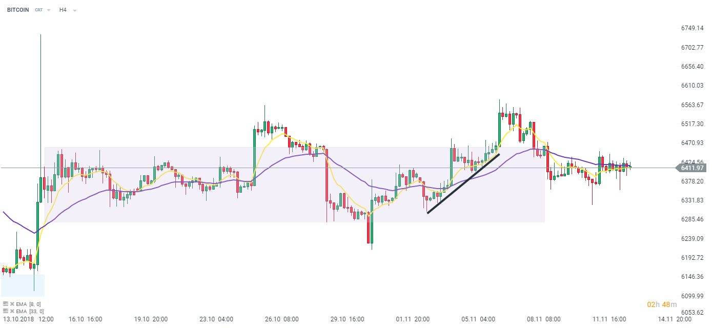 BITCOIN dnes mírně ztrácel, ale korekce byla spíše zanedbatelná. Jeho cena se drží v blízkosti 6400 USD. BITCOIN se zároveň pohybuje v blízkosti svých klouzavých průměrů 8 a 33 (žluté a fialové linie) na grafu H4. Zdroj: xStation5