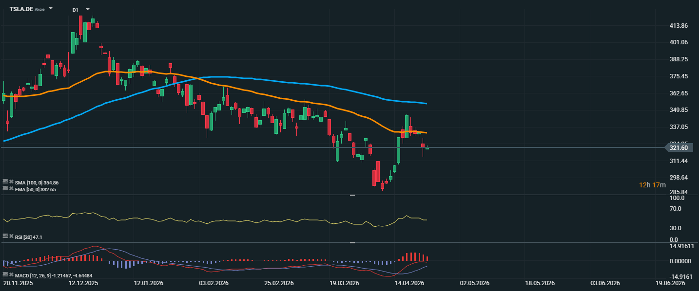 Akcie Tesly zostávajú v technicky slabšom nastavení a aktuálne sa pohybujú okolo 321,60 EUR. Cena sa stále nachádza pod EMA 50 na úrovni 332,65 EUR aj pod SMA 100 na hodnote 354,86 EUR, čo potvrdzuje, že strednodobý trend zostáva skôr negatívny. Krátkodobo sa Tesla pokúsila o obrat, keď cena prudko vyskočila k oblasti 337 EUR, ale tento rast zatiaľ nedokázala udržať. Aktuálny návrat pod hladinu 321,60 EUR naznačuje, že kupujúci strácajú kontrolu a trh opäť testuje nižšie úrovne. RSI sa nachádza na hodnote 47,1, teda tesne pod neutrálnou hranicou, čo ukazuje na slabšie momentum bez jasného signálu prepredanosti.