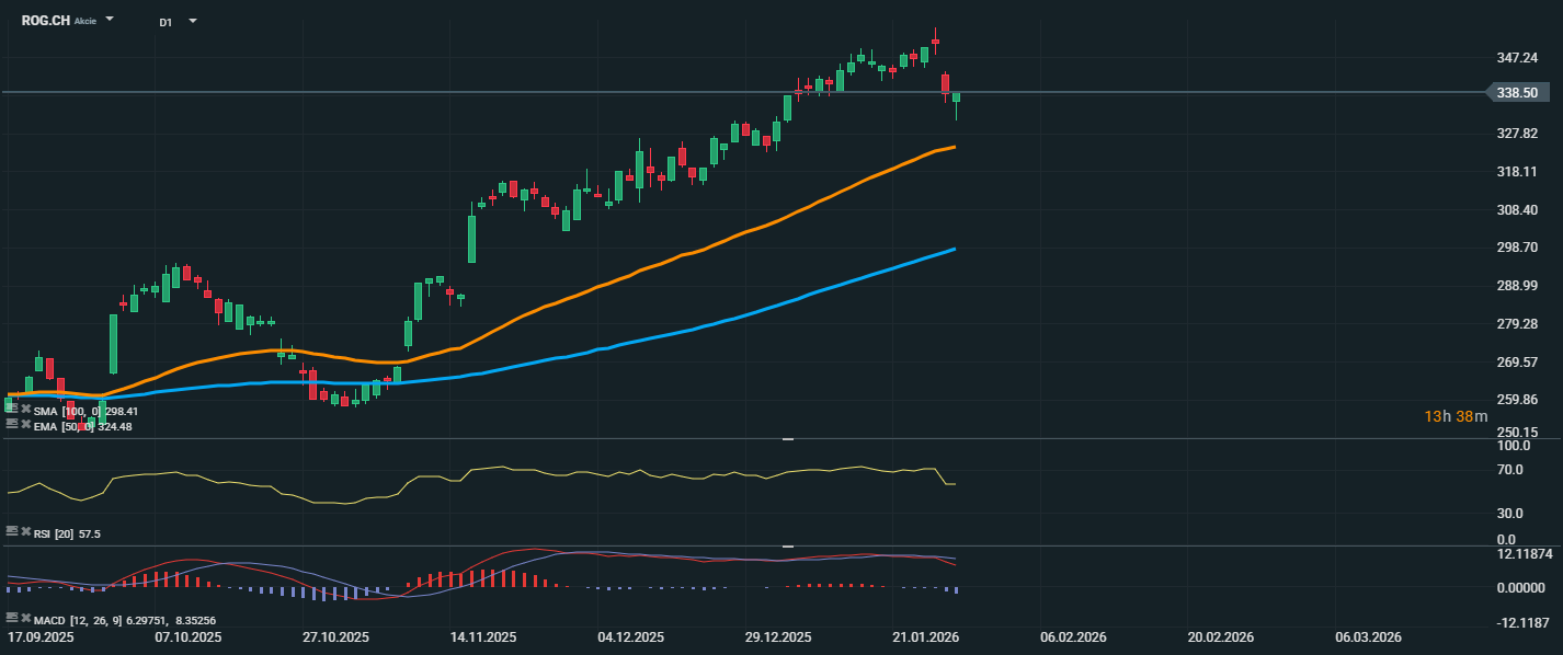 Akcie švajčiarskej farmaceutickej spoločnosti Roche Holding AG sa aktuálne obchodujú na cene 338,50 CHF, pričom v posledných dňoch zaznamenali miernu korekciu po predchádzajúcom silnom raste. Cena sa však naďalej drží výrazne nad kľúčovými kĺzavými priemermi – EMA 50 na úrovni 324,48 CHF a SMA 100 na 298,41 CHF, čo potvrdzuje pretrvávajúci býčí trend. RSI sa nachádza na hodnote 57,5, teda v neutrálnom pásme, no stále blízko prekúpenej oblasti, čo odzrkadľuje pretrvávajúci nákupný záujem bez známok prehrievania trhu. Z technického pohľadu sa akcie po silnej rally dostali do krátkodobej korekčnej fázy, avšak štruktúra vyšších maxím a miním zostáva zachovaná. Kľúčovou úrovňou pre udržanie pozitívneho scenára je EMA 50, ktorej prielom by mohol signalizovať hlbší pokles. Naopak, návrat nad hladinu 347 CHF, kde sa nachádza posledné lokálne maximum, by mohol otvoriť priestor pre ďalší rast.