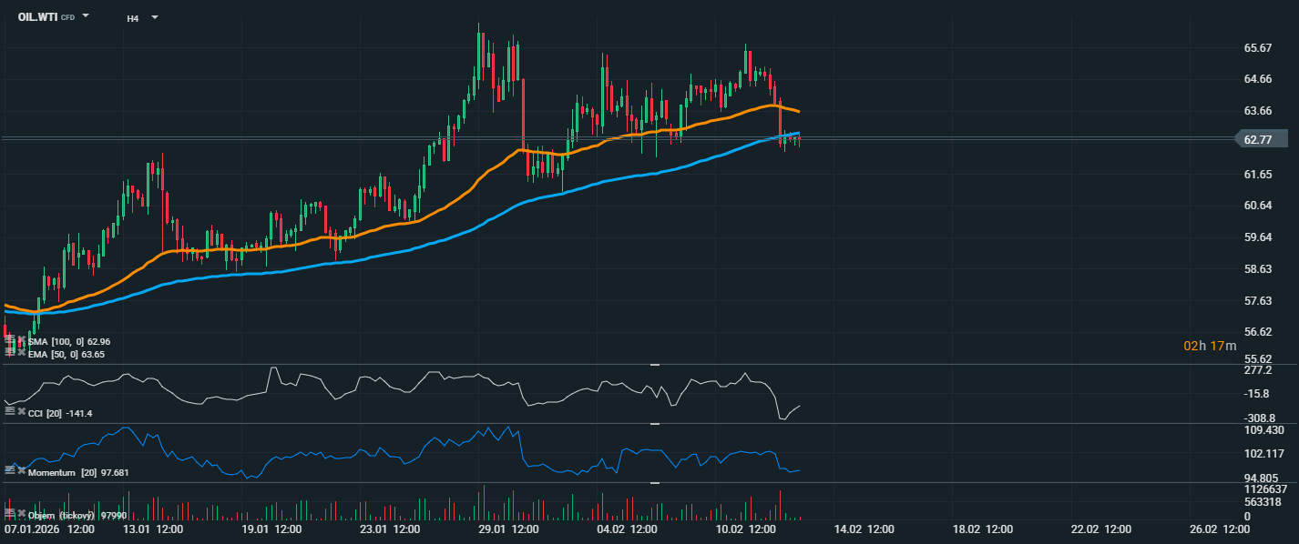 Odvtedy sa trh dostal do konsolidácie a teraz vytvára mierne klesajúcu štruktúru nižších maxím. Ak dôjde k jasnému prelomeniu pod SMA 100, mohlo by to otvoriť priestor pre hlbšiu korekciu smerom k oblasti 61,50 – 60,50 USD, kde sa nachádzala predchádzajúca konsolidačná zóna. CCI sa pohybuje okolo -141, t. j. v prepredanej zóne, čo môže signalizovať možnosť krátkodobého technického odrazu. Naopak, momentum klesá, čo potvrdzuje oslabenie kúpnej sily.