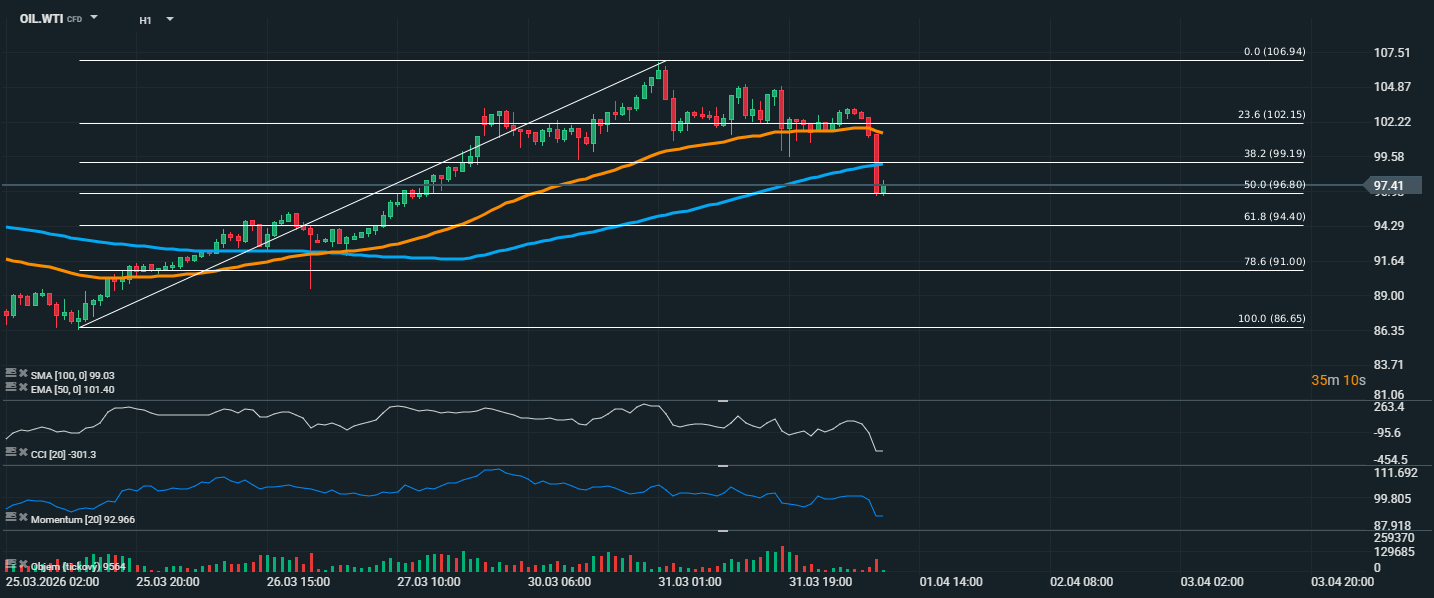Cena ropy po predchádzajúcej konsolidácii pod úrovňou 102,15 USD prudko oslabila a prepadla sa až k oblasti 96,80 USD, ktorá zodpovedá 50 % Fibonacciho retracementu. Zároveň došlo k prerazeniu pod EMA 50 na hodnote 101,40 USD a trh sa dostal aj pod SMA 100 na úroveň 99,03 USD, čo potvrdzuje prevahu predajcov a jasne medvedie nastavenie v krátkom horizonte.