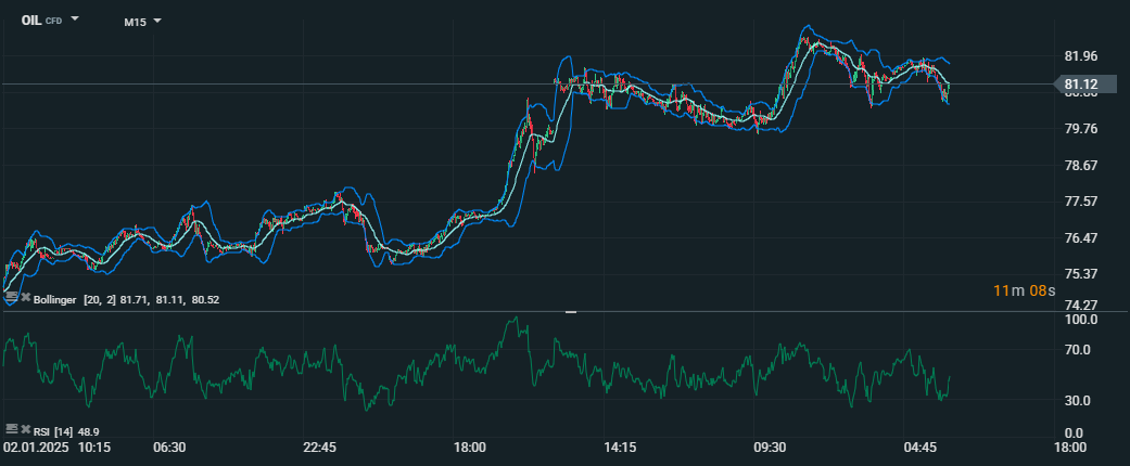 Vývoj ceny ropy (OIL CFD) na 15-minútovom grafe s indikátormi Bollingerove pásma (perióda 20) a Index relatívnej sily (RSI, perióda 14). Cena ropy dosiahla úroveň 81,96 USD za barel, následne klesla na 81,12 USD. RSI na úrovni 48,9 ukazuje neutrálny sentiment, pričom Bollingerove pásma naznačujú mierne zníženie volatility. Zdroj: xStation5