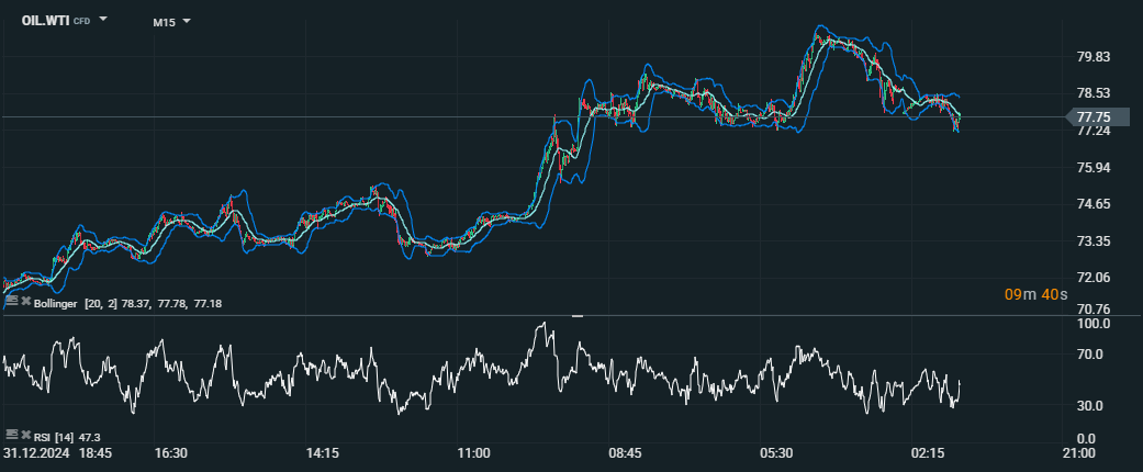 Vývoj ceny WTI ropy (OIL.WTI CFD) na 15-minútovom grafe s indikátormi Bollingerove pásma (perióda 20) a Index relatívnej sily (RSI, perióda 14). Cena dosiahla maximum na 78,53 USD za barel, no následne klesla na 77,75 USD. RSI na úrovni 47,3 signalizuje neutrálny sentiment trhu, pričom Bollingerove pásma naznačujú stabilizáciu volatility. Zdroj: xStation5