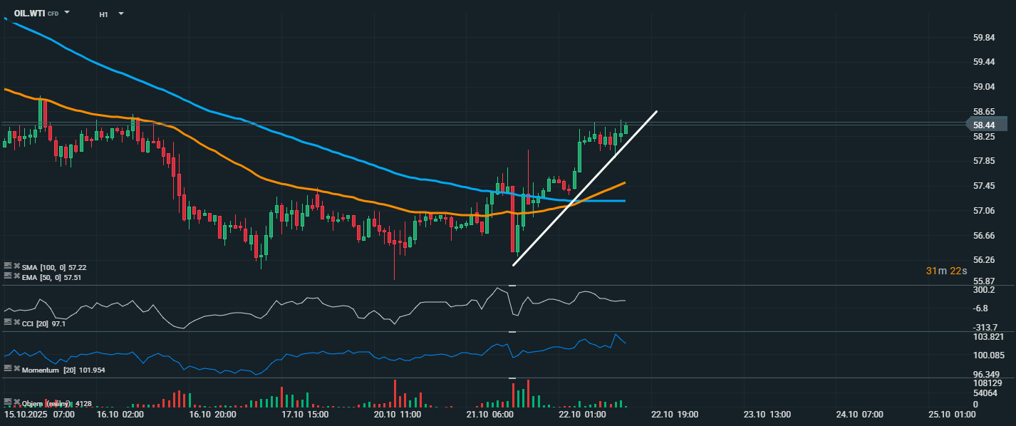 Cena americkej ropy WTI naďalej posilňuje a aktuálne sa obchoduje okolo úrovne 58,44 USD, čo predstavuje rast približne o 2 %. Na grafe je zreteľný jasný rastúci trend, podporený prierazom nad hlavné kĺzavé priemery – EMA 50 (57,51 USD) a SMA 100 (57,22 USD). Rast je navyše sprevádzaný výrazným momentom (101,95) a CCI (97,1), ktoré sa pohybujú v pásme prekúpenosti. To signalizuje silnú nákupnú aktivitu, no zároveň možnosť krátkodobej konsolidácie alebo technickej korekcie, ak sa nákupný tlak dočasne vyčerpá. Objem obchodov počas prierazu výrazne vzrástol, čo zvyšuje dôveru v silu aktuálneho pohybu. Trh môže cieliť na rezistenciu v pásme okolo 59,00–59,40 USD, kde sa nachádzajú predchádzajúce lokálne maximá.