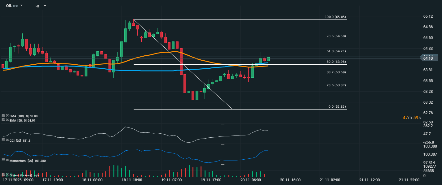 Cena ropy sa aktuálne pohybuje okolo 64,10 USD, teda nad Fibonacciho hladinou 50 % (63,95 USD), ktorá vznikla po predchádzajúcom poklese z 65,05 na 62,85 USD. Prerazenie tejto úrovne smerom nahor naznačuje potenciálne pokračovanie rastovej korekcie. Technicky vzaté došlo k prielomu krátkodobej klesajúcej trendovej línie a následnému rastu nad oba kĺzavé priemery – EMA 50 (63,91 USD) a SMA 100 (63,98 USD). Tým sa obnovilo krátkodobé býčie nastavenie. CCI sa nachádza na vysokej hodnote 151,3, čo značí prekúpenosť trhu, ale zároveň potvrdzuje silu nákupného momenta. Rovnako aj momentum (101,28) ukazuje na zosilňujúcu dynamiku rastu. Objem obchodov v posledných sviečkach taktiež podporuje aktivitu kupujúcich.