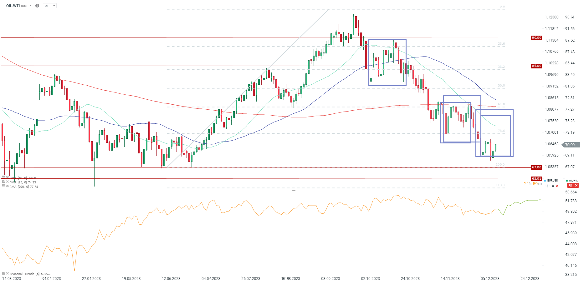 Ropa WTI je dnes späť nad 70 USD/b a už testovala takmer 71 USD/b. Index sezónnosti ukazuje na potenciálne ďalšie oživenie trhu.