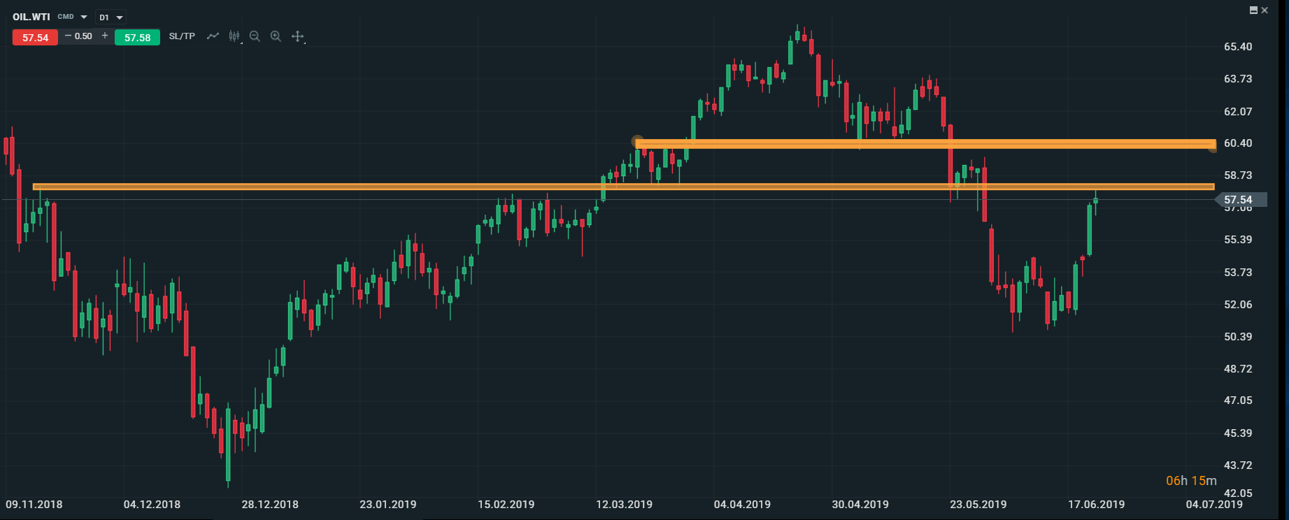 Ropa WTI (OIL.WTI) testuje úroveň 58 USD/bbl. V prípade, ak cena dokáže uzavrieť nad touto úrovňou, otvorí sa priestor na rast k úrovni 60 USD/bbl. Zdroj: xStation5