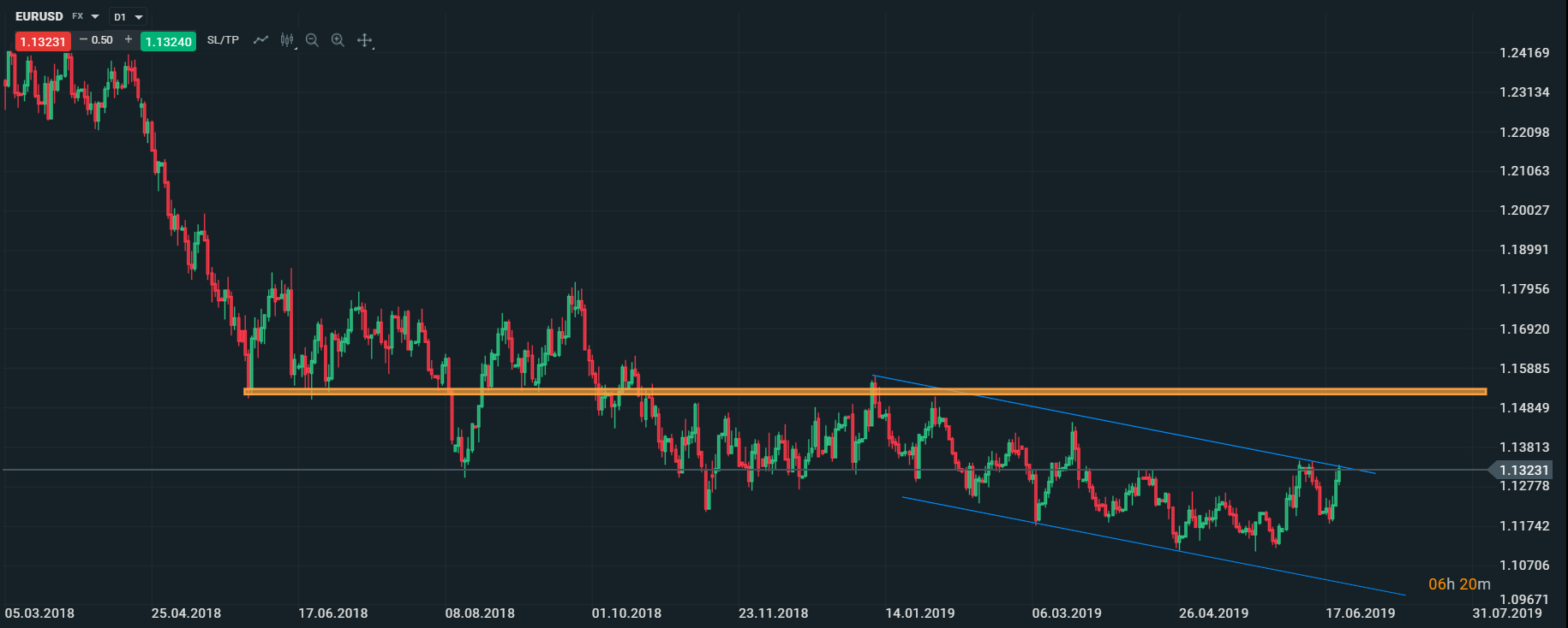 Menový pár EURUSD testuje kľúčovú úroveň rezistenciu, ktorú reprezentuje vrchná časť klesajúceho trendového kanála. V prípade, ak cena dokáže uzavrieť nad touto úrovňou, otvorí sa priestor pre rast k úrovni 1,15 EURUSD. Zdroj: xStation5