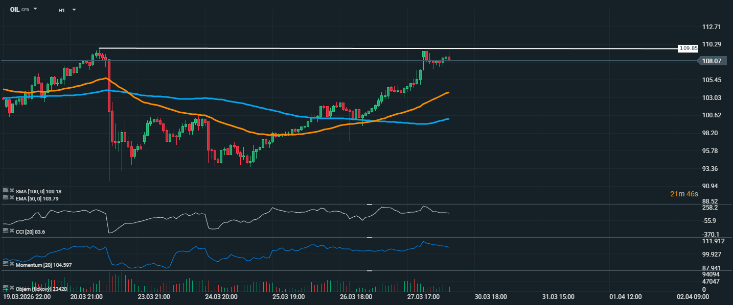 Cena ropy sa vrátila do výrazne býčieho nastavenia a aktuálne sa pohybuje okolo 108,07 USD. Trh sa po predchádzajúcej volatilite stabilizoval a počas posledných seáns predviedol silný rastový impulz, vďaka ktorému sa dostal výrazne nad EMA 50 na úrovni 103,79 USD aj nad SMA 100 okolo 100,18 USD. To potvrdzuje obnovenú prevahu kupujúcich a zlepšenie krátkodobého technického obrazu. Aktuálne je veľmi dôležitá rezistenčná zóna v okolí 109,85 USD, ktorú cena opäť testuje. Práve táto hladina zatiaľ bráni pokračovaniu rastu a trh tu krátkodobo konsoliduje po prudkom posune nahor. CCI sa drží v blízkosti hodnoty 83,6, čo ukazuje na stále silné momentum, hoci trh už vstupuje do zvýšene napätej oblasti. Aj Momentum na úrovni 104,6 potvrdzuje, že kupujúci majú situáciu naďalej pod kontrolou, napriek tomu je viditeľné mierne spomalenie rastovej dynamiky.